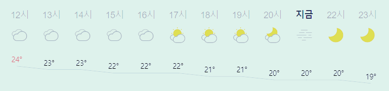 어제보다 2도 높은 최저기온, 어제보다 4도 낮은 최고기온입니다 아침에 최저기온 영상 19도이고 낮에 최고기온 영상 24도입니다 오전 2시 - 3시 하루 중 최저기온이고 낮 12시 하루 중 최고기온입니다