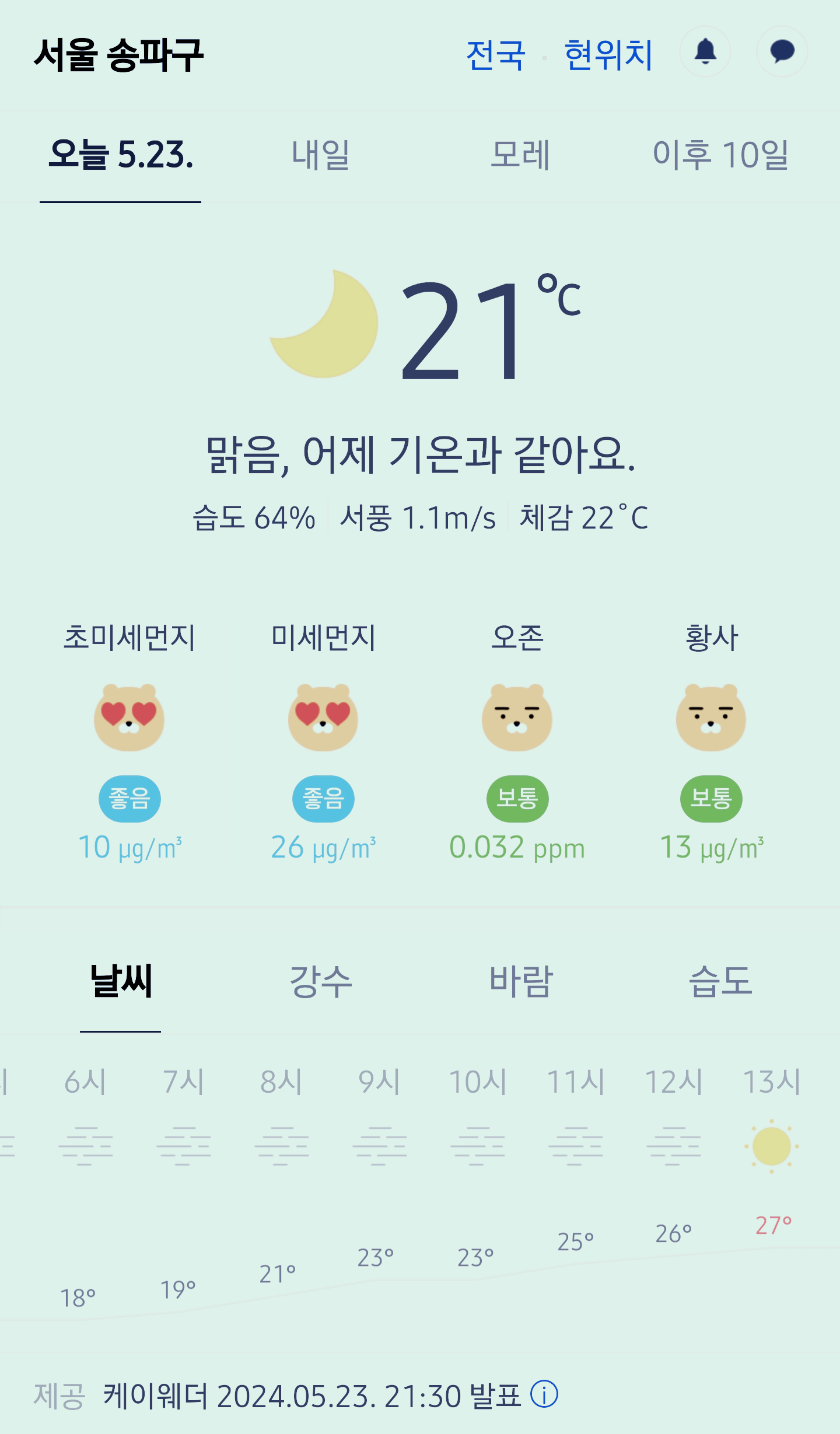 서울 강남 송파구 오늘의 날씨 2024년 5월 23일 (21시 30분 현재)