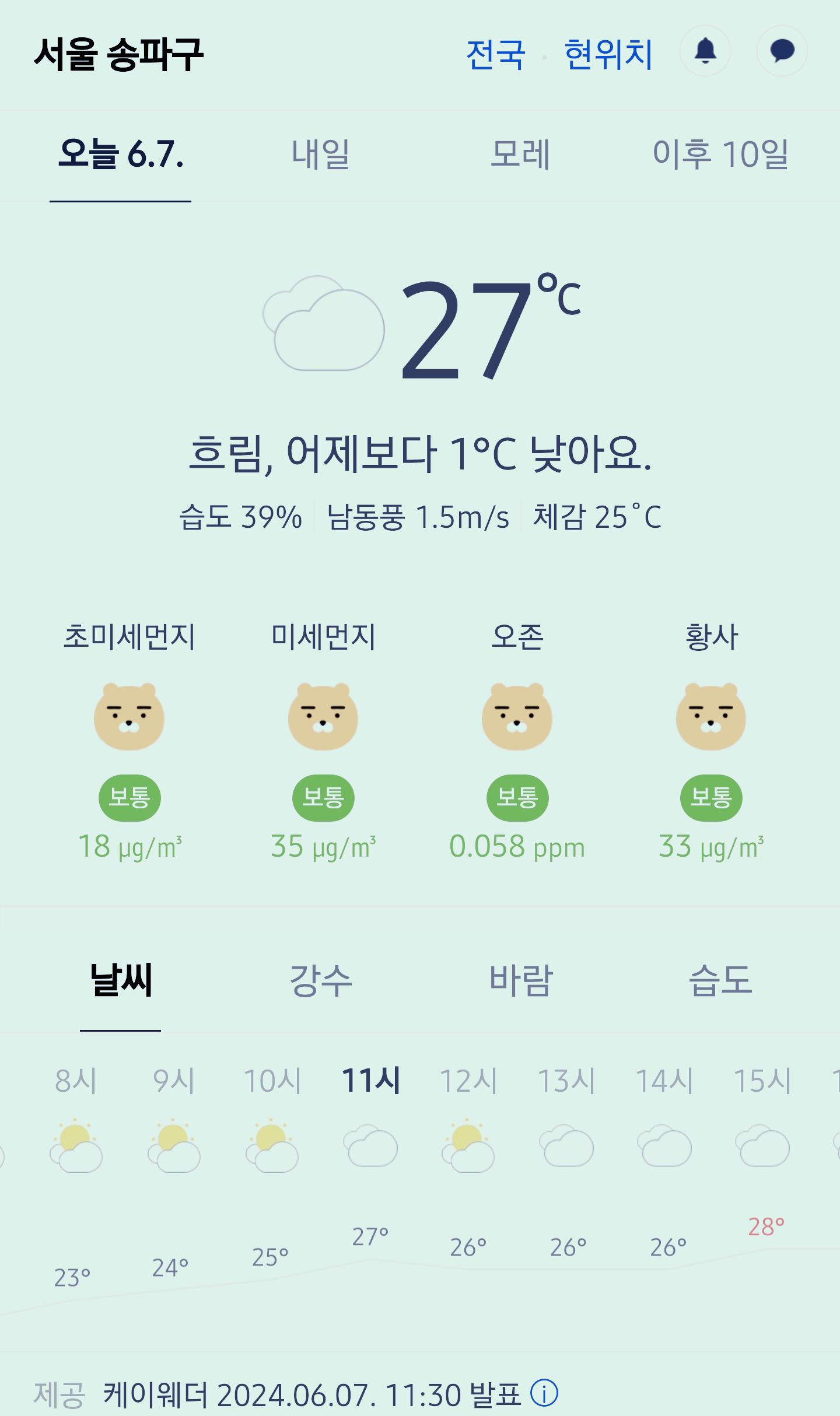 서울 강남 송파구 오늘의 날씨 2024년 6월 7일 (11시 30분 현재)