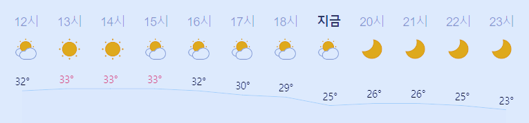 어제와 같은 최저기온, 어제보다 1도 높은 최고기온입니다 아침에 최저기온 영상 19도이고 낮에 최고기온 영상 33도입니다 오전 4시 - 5시 하루 중 최저기온이고 낮 13시 - 15시 하루 중 최고기온입니다