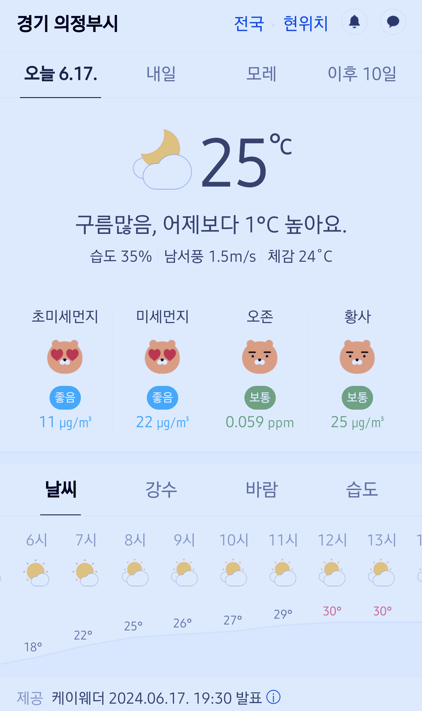 >>>경기도 의정부시 날씨 2024년 6월 17일. 의정부 날씨, 오늘의 날씨, 오늘 날씨, 2024 0617, 초미세먼지, 미세먼지, 황사, 자외선
