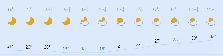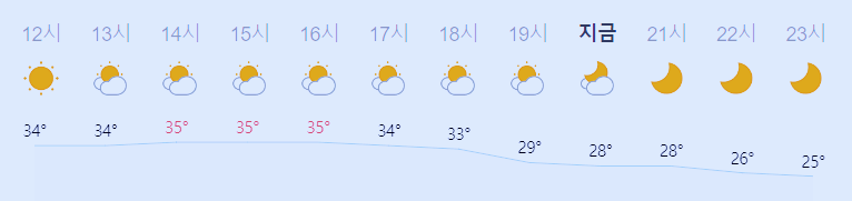어제보다 1도 높은 최저기온이고 어제보다 2도 높은 최고기온입니다 아침에 최저기온 영상 21도이고 낮에 최고기온 영상 35도입니다 오전 3시 - 5시 하루 중 최저기온이고 낮 14시 - 16시 하루 중 최고기온입니다