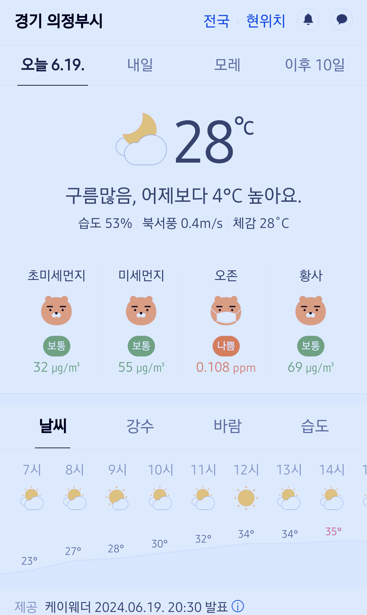 >>>경기도 의정부시 날씨 2024년 6월 19일. 의정부 날씨, 오늘의 날씨, 오늘 날씨, 2024 0619, 초미세먼지, 미세먼지, 황사, 자외선