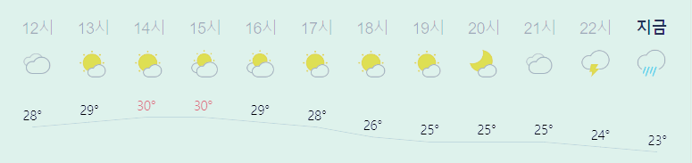 어제와 같은 최저기온이고 어제보다 4도 높은 최고기온입니다 아침에 최저기온 영상 22도이고 낮에 최고기온 영상 30도입니다 오전 6시 하루 중 최저기온이고 낮 14시 - 15시 하루 중 최고기온입니다