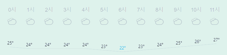 최저기온 22도(오전, 오후), 최고기온 26도(오전), 24도(오후)