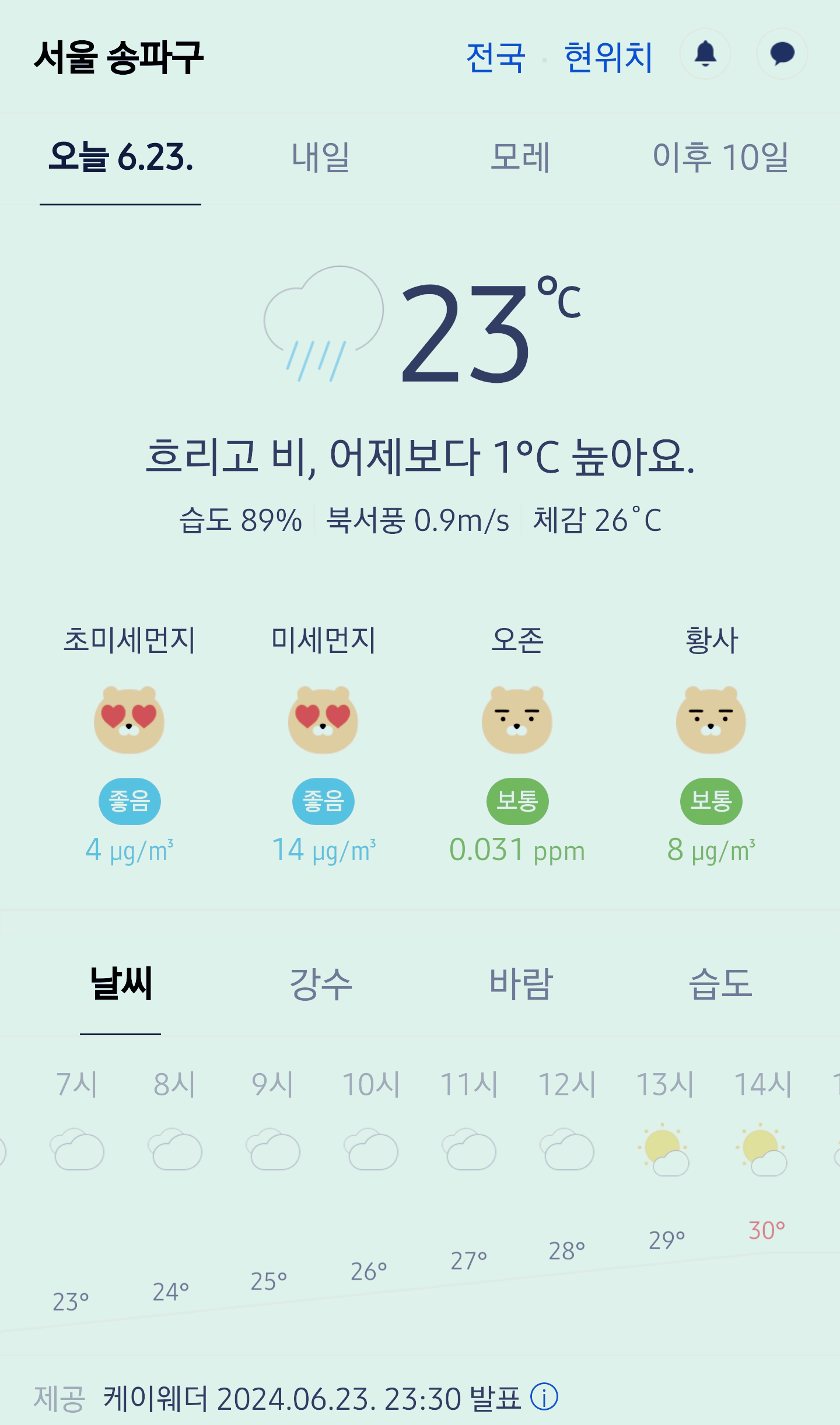 서울 강남 송파구 오늘의 날씨 2024년 6월 23일 (23시 30분 현재)