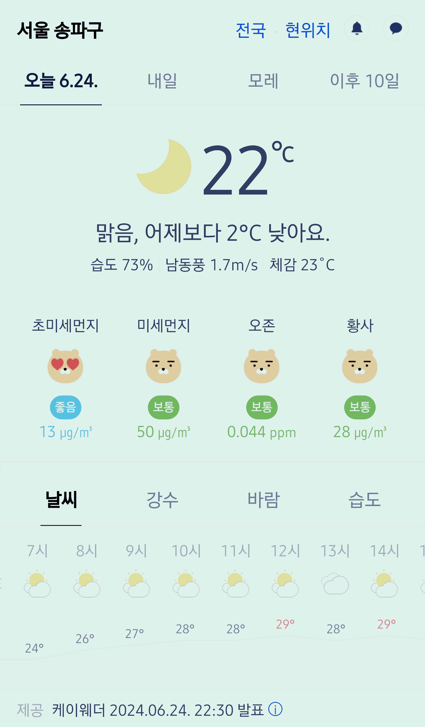 서울 강남 송파구 오늘의 날씨 2024년 6월 24일 (22시 30분 현재)