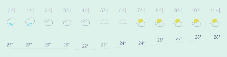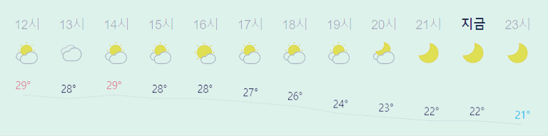 최저기온 22도(오전), 21도(밤), 최고기온 29도(오후)