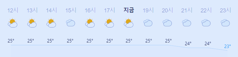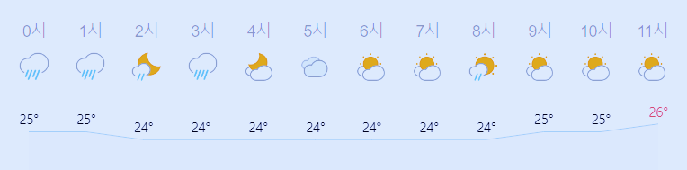 최저기온 24도(오전), 23도(밤), 최고기온 26도(오전), 25도(오후)