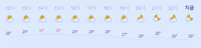 어제보다 1도 낮은 최저기온이고 어제보다 4도 높은 최고기온입니다 아침에 최저기온 영상 24도이고 낮에 최고기온 영상 30도입니다 오전 0시 - 5시 하루 중 최저기온이고 낮 14시 - 15시 하루 중 최고기온입니다