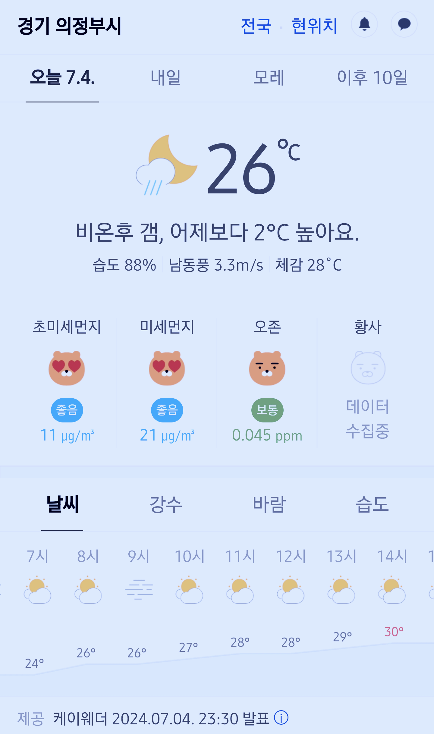 경기도 의정부시 오늘의 날씨 2024년 7월 4일 (23시 30분 현재)