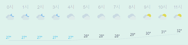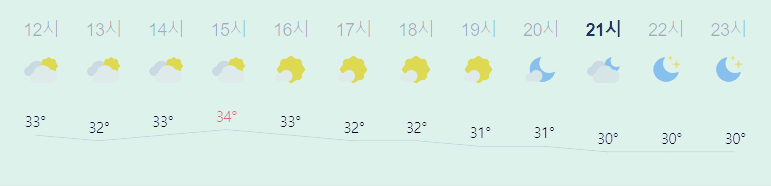 어제보다 1도 높은 최저기온이고 어제보다 1도 높은 최고기온입니다 아침에 최저기온 영상 28도이고 낮에 최고기온 영상 34도입니다 오전 0시 - 4시 하루 중 최저기온이고 낮 15시 하루 중 최고기온입니다