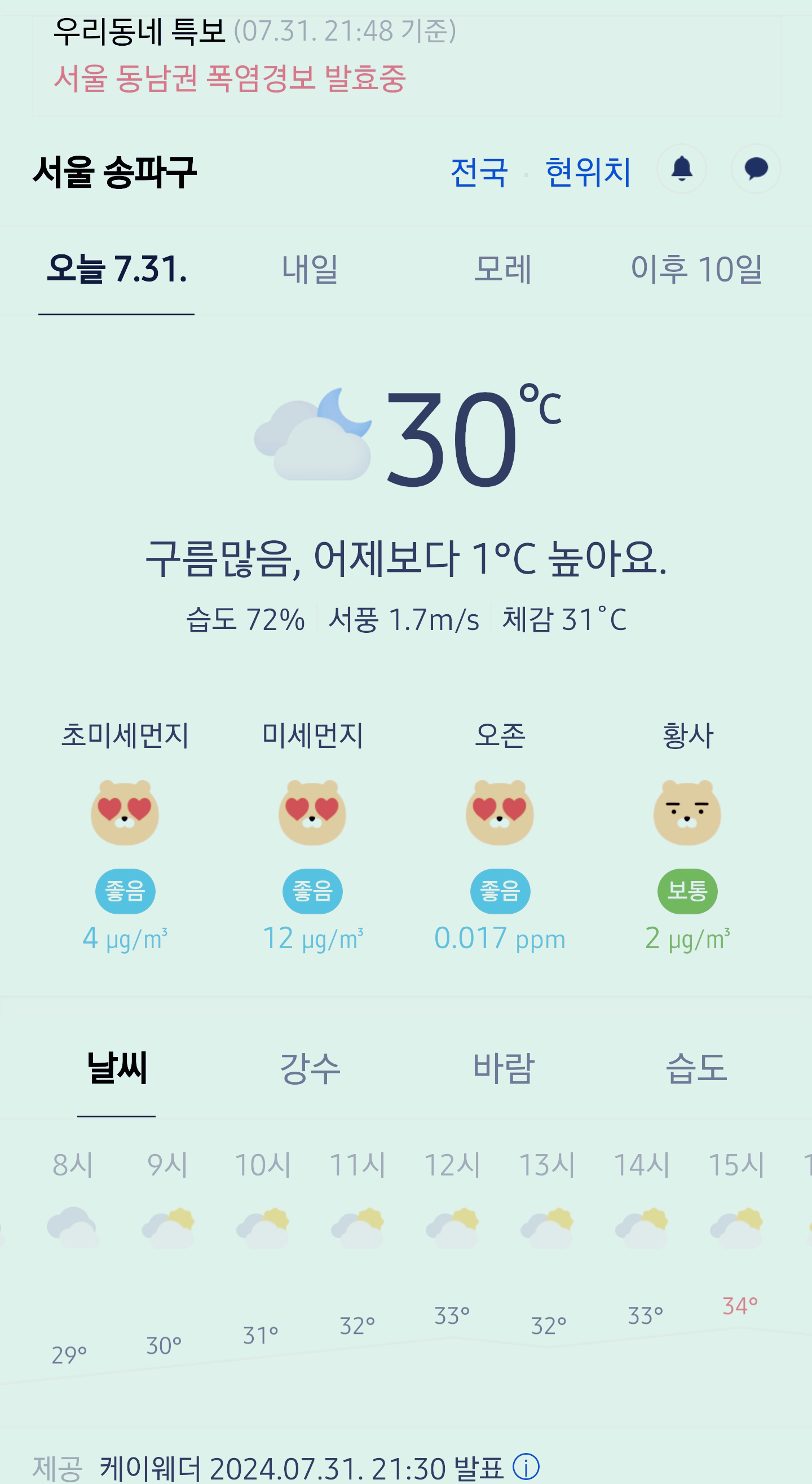 서울 강남 송파구 오늘의 날씨 2024년 7월 31일 (21시 30분 현재)