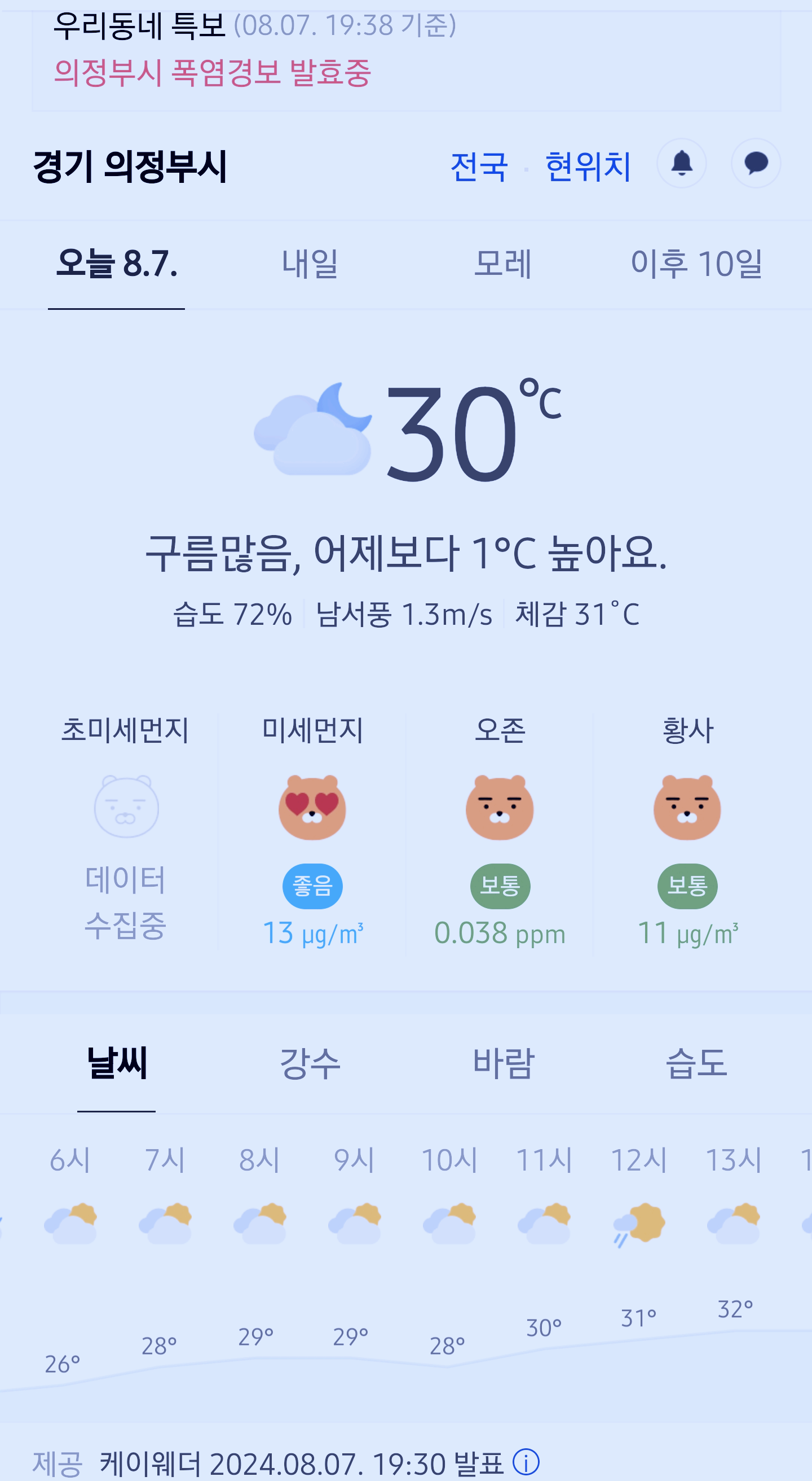 >>>경기도 의정부시 날씨 2024년 8월 7일. 의정부 날씨, 폭염경보 발효중, 오늘의 날씨, 오늘 날씨, 2024 0807, 초미세먼지, 미세먼지, 황사, 자외선