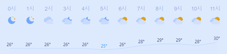 어제보다 1도 높은 최저기온이고 어제보다 1도 높은 최고기온입니다 아침에 최저기온 영상 26도이고 낮에 최고기온 영상 33도입니다 오전 5시 하루 중 최저기온이고 낮 15시 하루 중 최고기온입니다