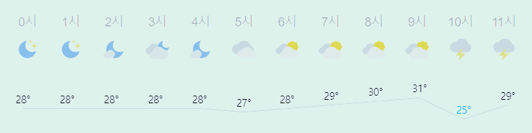 어제와 같은 최저기온이고 어제보다 1도 낮은 최고기온입니다 아침에 최저기온 영상 25도이고 낮에 최고기온 영상 33도입니다 오전 10시 하루 중 최저기온이고 낮 13시 - 17시 하루 중 최고기온입니다