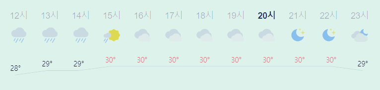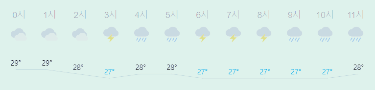 어제와 같은 최저기온이고 어제보다 5도 낮은 최고기온입니다 아침에 최저기온 영상 27도이고 낮에 최고기온 영상 30도입니다 오전 3시 - 10시 하루 중 최저기온이고 낮 15시 - 22시 하루 중 최고기온입니다