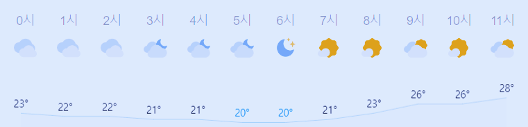 어제보다 1도 낮은 최저기온이고 어제보다 4도 높은 최고기온입니다 아침에 최저기온 영상 20도이고 낮에 최고기온 영상 31도입니다 오전 5시 - 6시 하루 중 최저기온이고 낮 13시 - 15시 하루 중 최고기온입니다