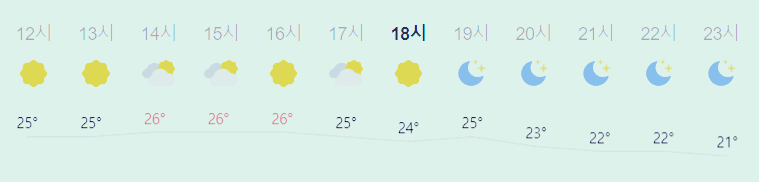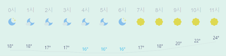 어제보다 1도 낮은 최저기온이고 어제와 같은 최고기온입니다 아침에 최저기온 영상 16도이고 낮에 최고기온 영상 26도입니다 오전 4시 - 6시 하루 중 최저기온이고 낮 14시 - 16시 하루 중 최고기온입니다