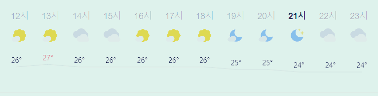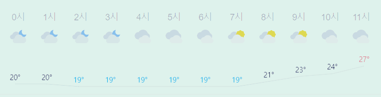 어제보다 3도 높은 최저기온이고 어제보다 1도 높은 최고기온입니다 아침에 최저기온 영상 19도이고 낮에 최고기온 영상 27도입니다 오전 2시 - 7시 하루 중 최저기온이고 낮 13시 하루 중 최고기온입니다