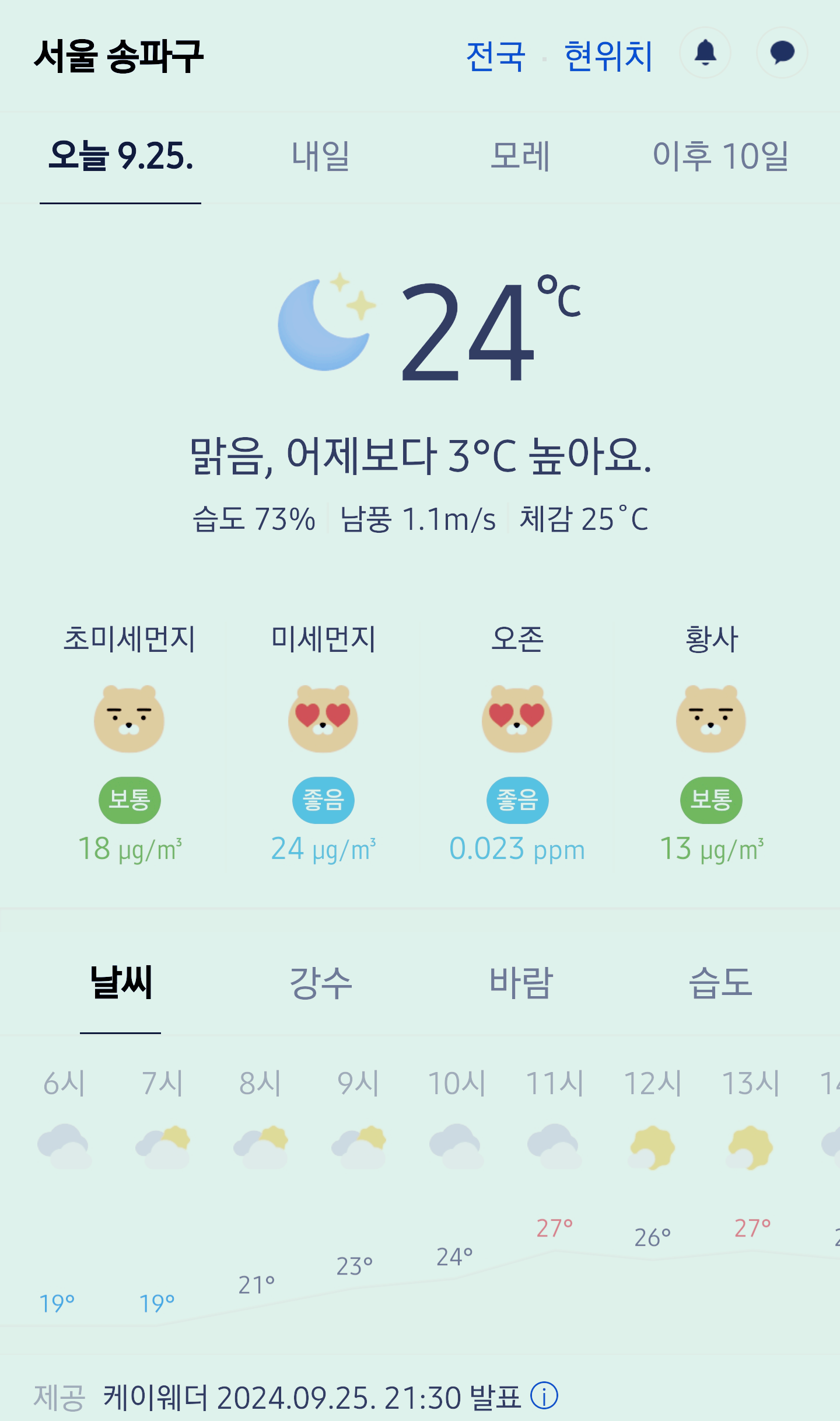 서울 강남 송파구 오늘의 날씨 2024년 9월 25일 (21시 30분 현재)