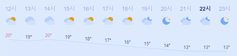 어제보다 2도 높은 최저기온이고 어제보다 3도 높은 최고기온입니다 아침에 최저기온 영상 12도이고 낮에 최고기온 영상 20도입니다 오전 5시 - 6시 하루 중 최저기온이고 낮 12시 - 14시 하루 중 최고기온입니다
