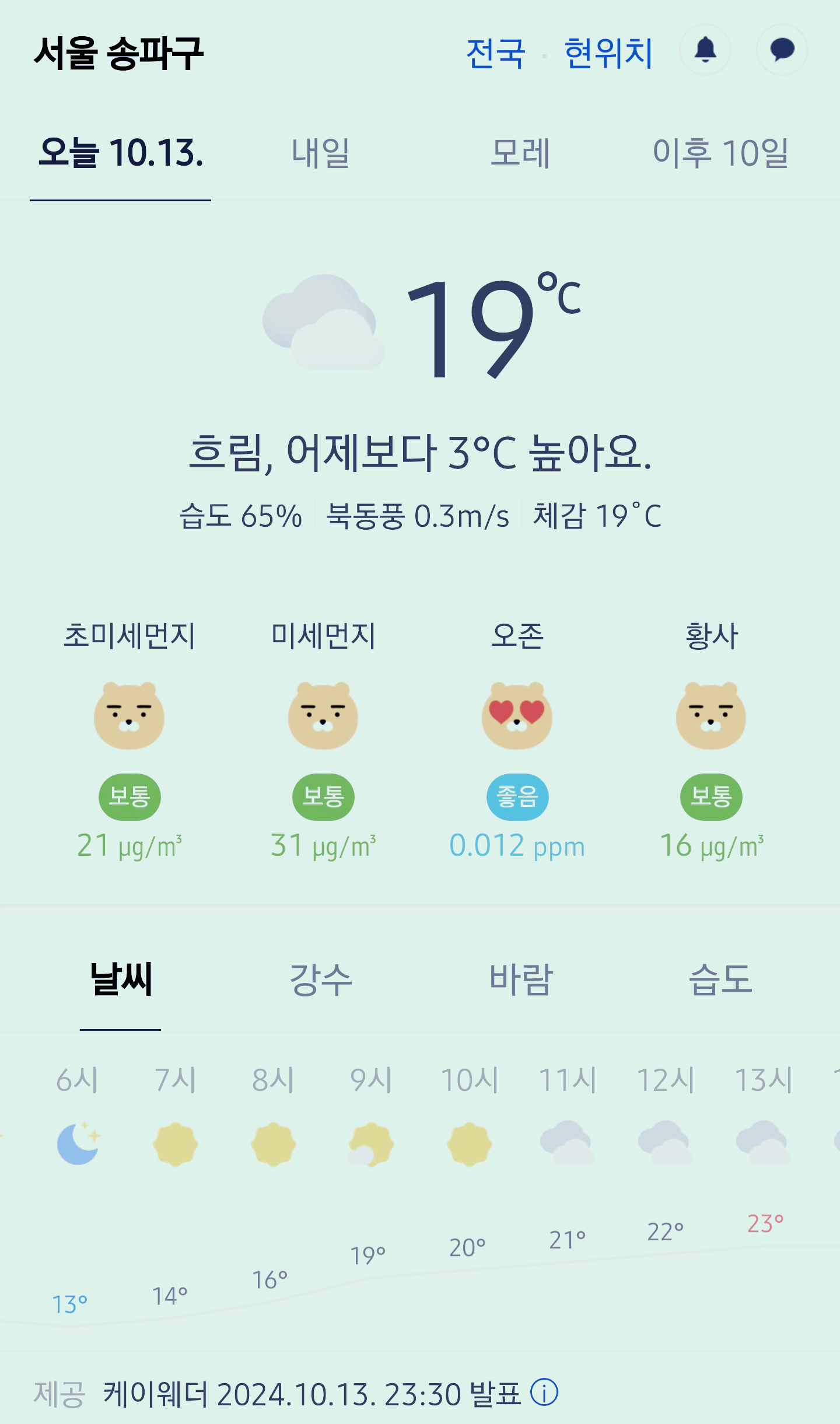 서울 강남 송파구 오늘의 날씨 2024년 10월 13일 (23시 30분 현재)