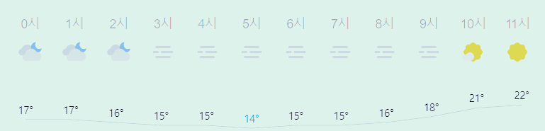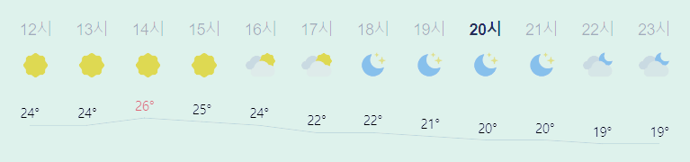 어제보다 2도 낮은 최저기온이고 어제보다 2도 높은 최고기온입니다 아침에 최저기온 영상 15도이고 낮에 최고기온 영상 26도입니다 오전 5시 하루 중 최저기온이고 낮 14시 하루 중 최고기온입니다
