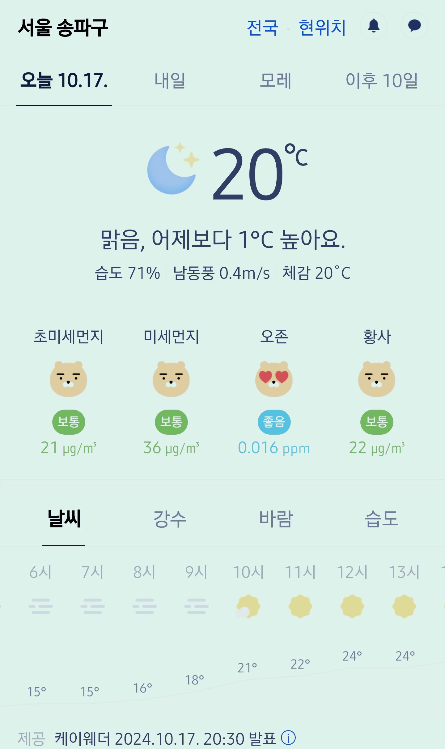 서울 강남 송파구 오늘의 날씨 2024년 10월 17일 (20시 30분 현재)
