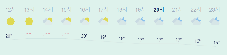 어제보다 2도 높은 최저기온이고 어제보다 4도 높은 최고기온입니다 아침에 최저기온 영상 11도이고 낮에 최고기온 영상 21도입니다 오전 5시 하루 중 최저기온이고 낮 13시 - 15시 하루 중 최고기온입니다
