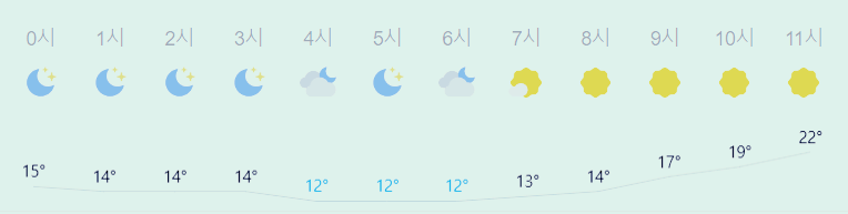 어제보다 2도 높은 최저기온이고 어제보다 2도 높은 최고기온입니다 아침에 최저기온 영상 12도이고 낮에 최고기온 영상 23도입니다 오전 4시 - 6시 하루 중 최저기온이고 낮 13시 - 15시 하루 중 최고기온입니다