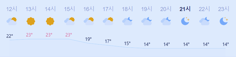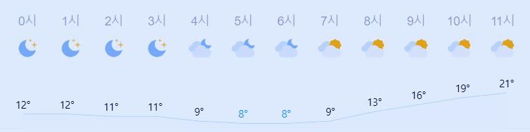 어제보다 1도 높은 최저기온이고 어제보다 1도 높은 최고기온입니다 아침에 최저기온 영상 8도이고 낮에 최고기온 영상 23도입니다 오전 5시 - 6시 하루 중 최저기온이고 낮 13시 - 15시 하루 중 최고기온입니다 11월도 안 됐는데 한 자리수 최저기온 영상 8도 실화입니까