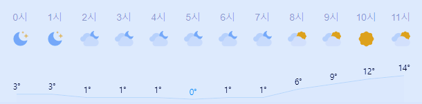 어제보다 1도 높은 최저기온이고 어제보다 2도 높은 최고기온입니다 아침에 최저기온 영상 1도이고 낮에 최고기온 영상 17도입니다 오전 5시 하루 중 최저기온이고 낮 12시 - 15시 하루 중 최고기온입니다 어제 새벽 최저 -1도에 이어 오늘은 0도입니다