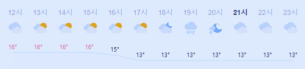 어제보다 4도 높은 최저기온이고 어제보다 4도 낮은 최고기온입니다 아침에 최저기온 영상 13도이고 낮에 최고기온 영상 16도입니다 오전 2시 - 3시 하루 중 최저기온이고 아침 9시 - 낮 15시 하루 중 최고기온입니다