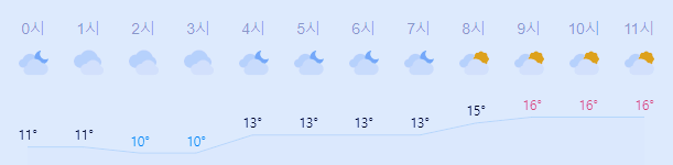 최저기온 10도(오전), 최고기온 16도(오전, 오후)