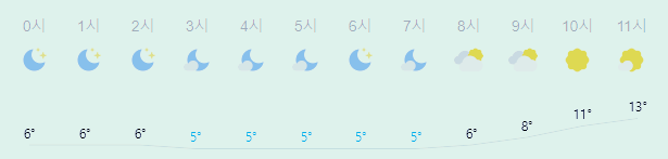 어제보다 1도 높은 최저기온이고 어제보다 2도 높은 최고기온입니다 아침에 최저기온 영상 5도이고 낮에 최고기온 영상 15도입니다 오전 3시 - 7시 하루 중 최저기온이고 낮 12시 - 15시 하루 중 최고기온입니다