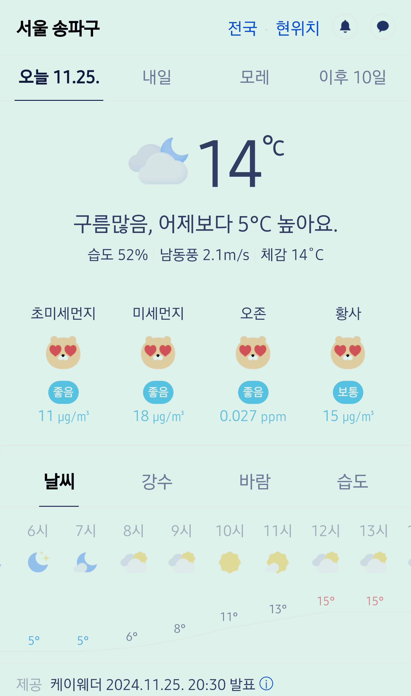 서울 강남 송파구 오늘의 날씨 2024년 11월 25일 (20시 30분 현재)