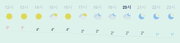 어제보다 1도 높은 최저기온이고 어제보다 3도 낮은 최고기온입니다 아침에 최저기온 영상 2도이고 낮에 최고기온 영상 5도입니다 밤 22시 - 23시 하루 중 최저기온이고 낮 12시 - 13시 하루 중 최고기온입니다