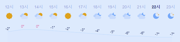 최저기온 -2도(오전), -6도(밤), 최고기온 1도(오전), 0도(오후)
