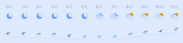 어제보다 3도 낮은 최저기온이고 어제보다 1도 낮은 최고기온입니다 아침에 최저기온 영하 9도이고 낮에 최고기온 0도입니다 오전 5시 - 7시 하루 중 최저기온이고 낮 13시 - 14시 하루 중 최고기온입니다