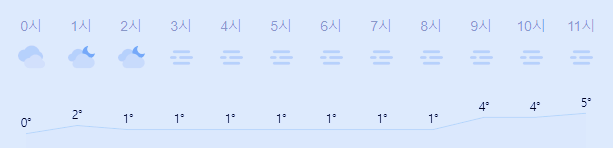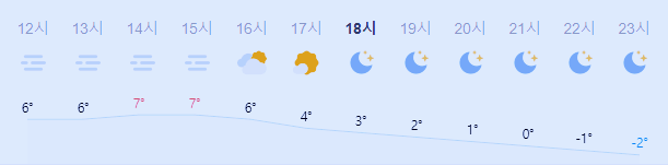 어제보다 2도 높은 최저기온이고 어제보다 1도 높은 최고기온입니다 아침에 최저기온 영상 1도이고 낮에 최고기온 영상 7도입니다 밤 23시 하루 중 최저기온이고 낮 14시 - 15시 하루 중 최고기온입니다