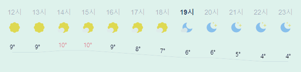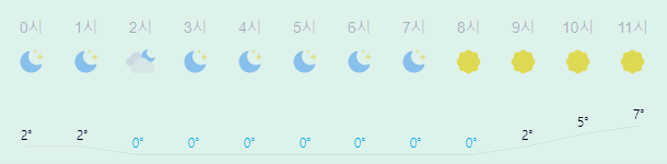 어제보다 3도 높은 최저기온이고 어제보다 4도 높은 최고기온입니다 아침에 최저기온 0도이고 낮에 최고기온 영상 10도입니다 오전 2시 - 8시 하루 중 최저기온이고 낮 14시 - 15시 하루 중 최고기온입니다