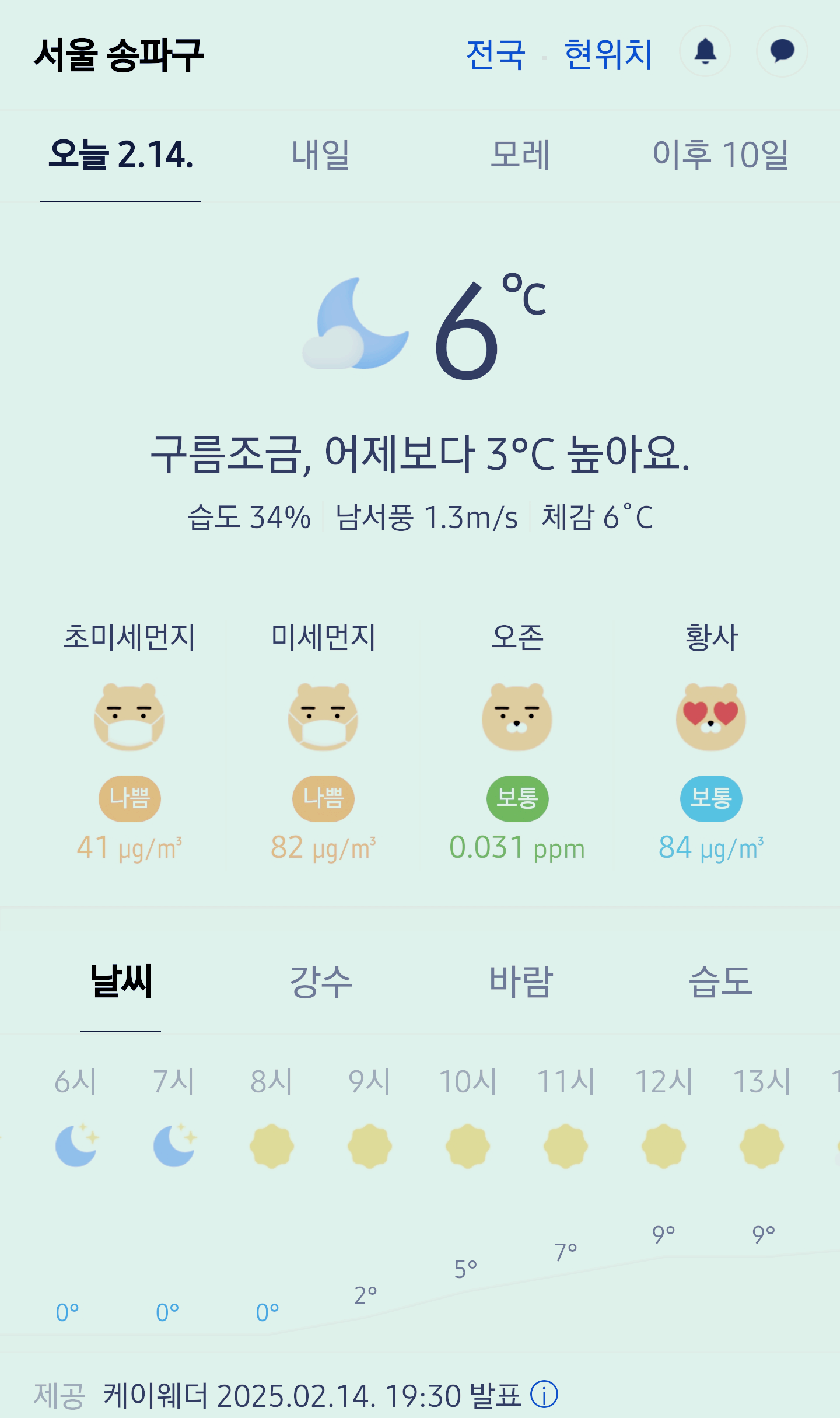 서울 강남 송파구 오늘의 날씨 2025년 2월 14일 (19시 30분 현재)