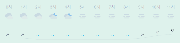 어제보다 1도 높은 최저기온이고 어제보다 2도 낮은 최고기온입니다 아침에 최저기온 영상 1도이고 낮에 최고기온 영상 8도입니다 오전 2시 - 8시 하루 중 최저기온이고 낮 15시 하루 중 최고기온입니다