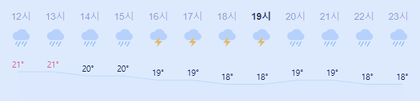 어제보다 1도 낮은 최저기온이고 어제보다 2도 낮은 최고기온입니다 아침에 최저기온 영상 18도이고 오후에 최고기온 영상 21도입니다 오전 1시 하루 중 최저기온이고 오후 12시 - 13시 하루 중 최고기온입니다