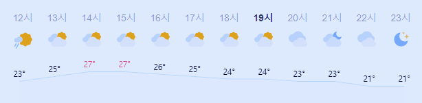 어제보다 2도 높은 최저기온이고 어제보다 3도 낮은 최고기온입니다 아침에 최저기온 영상 19도이고 오후에 최고기온 영상 27도입니다 오전 5시 하루 중 최저기온이고 낮 14시 - 15시 하루 중 최고기온입니다