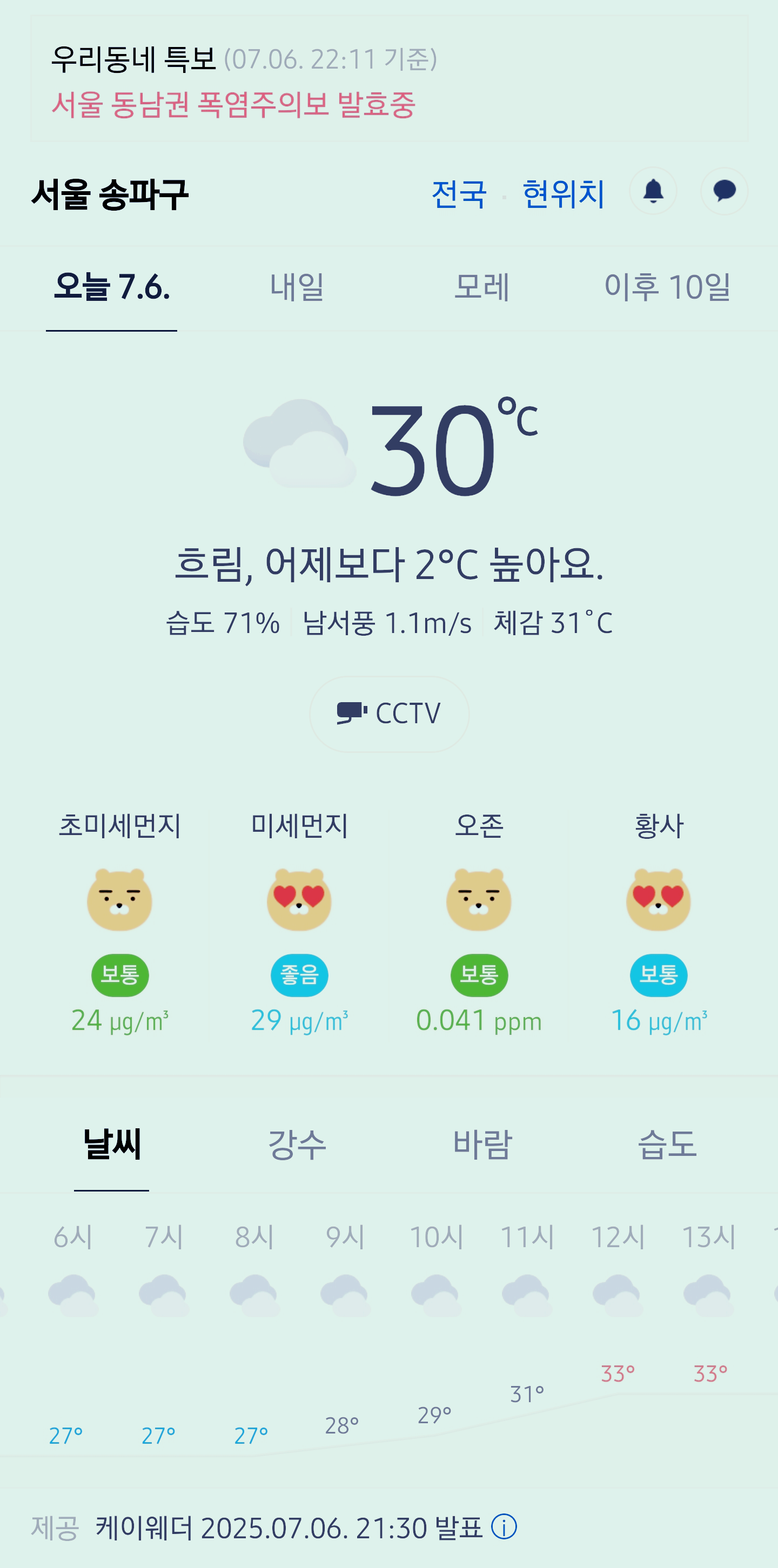>>>서울 강남 송파구 날씨 2025년 7월 6일. 서울 강남구 오늘의 날씨, 폭염주의보 발효중, 오늘 날씨, 2025 0706, 초미세먼지, 미세먼지, 황사, 자외선