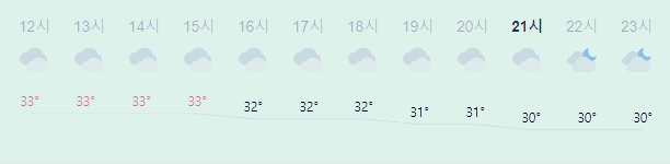 어제보다 1도 높은 최저기온이고 어제보다 1도 높은 최고기온입니다 아침에 최저기온 영상 27도이고 오후에 최고기온 영상 33도입니다 오전 1시 - 8시 하루 중 최저기온이고 오후 12시 - 15시 하루 중 최고기온입니다