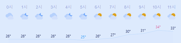 최저기온 27도(오전), 26도(오후), 최고기온 33도(오후)