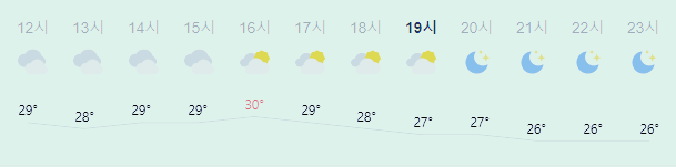 어제보다 3도 높은 최저기온, 어제보다 4도 낮은 최고기온입니다 아침에 최저기온 영상 25도이고 오후에 최고기온 영상 30도입니다 오전 5시 - 6시 하루 중 최저기온이고 낮 16시 하루 중 최고기온입니다
